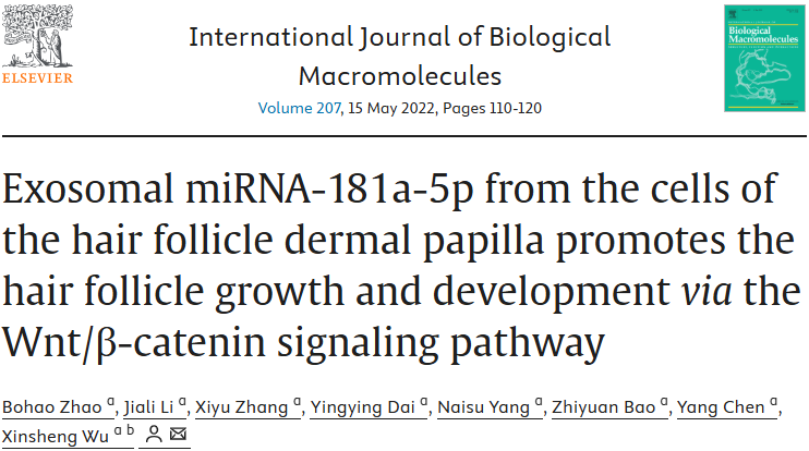 資料來源:Zhao, B., Li, J., et al. (2022). Exosomal miRNA-181a-5p from the cells of the hair follicle dermal papilla promotes the hair follicle growth and development via the Wnt/β-catenin signaling pathway. International journal of biological macromolecules, 207, 110–120.