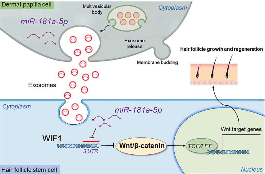 miRNA-181a-5p:啟動毛囊訊號的關鍵分子研究指出,HFDPCs分泌的外泌體中,含有一種名為miRNA-181a-5p的microRNA,這個分子能夠活化Wnt/β-catenin路徑。研究顯示,特定miRNA可透過調控該路徑相關分子的表現,影響β-catenin的穩定性與核內活性,進而參與毛囊幹細胞的活化與毛囊生長訊號的傳遞,而當Wnt/β-catenin訊號被啟動後,毛囊幹細胞的增殖能力提升,也會使毛囊在健康的生長狀態。